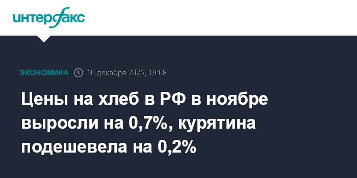 Цены на хлеб в РФ в ноябре выросли на 0,7%, курятина подешевела на 0,2%