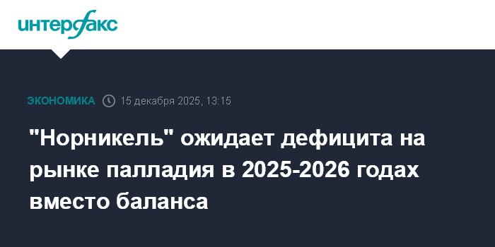 Москва. 15 декабря. INTERFAX.RU - "Норильский никель" ожидает дефицита на рынке палладия в 2025 и 2026 годах, говорится в его обзоре рынка металлов.