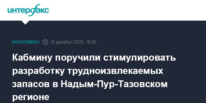 Москва. 15 декабря. INTERFAX.RU - Президент РФ Владимир Путин поручил правительству совместно с исполнительными органами Ямало-Ненецкого автономного округа (ЯНАО) обеспечить стимулирование разработки трудноизвлекаемых запасов в Надым-Пур-Тазовском регионе.