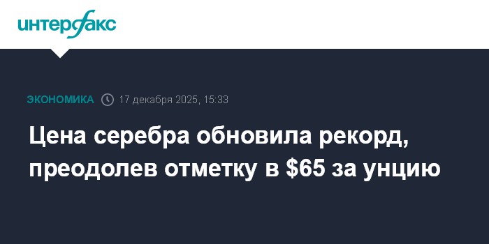 Москва. 17 декабря. INTERFAX.RU - Цена серебра на спотовом рынке обновила рекордный максимум, поднявшись выше $65 за унцию, золото также дорожает.