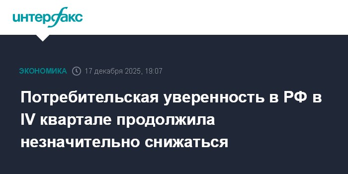 Москва. 17 декабря. INTERFAX.RU - Индекс потребительской уверенности, отражающий совокупные потребительские ожидания населения РФ, в IV квартале 2025 года снизился на 2 процентных пункта до минус 11% после минус 9% в III квартале, минус 8% во II квартале, минус 11% в I квартале, минус 9% в IV квартале 2024 года, минус 7% в III квартале, минус 6% во II квартале 2024 года (максимальный уровень с 2014 года), сообщил в среду Росстат (опрос был проведен с 1 по 10 ноября).