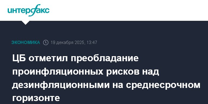 Москва. 19 декабря. INTERFAX.RU - Проинфляционные риски по-прежнему преобладают над дезинфляционными на среднесрочном горизонте, говорится в пресс-релизе Банка России по итогам заседания совета директоров по ключевой ставке.