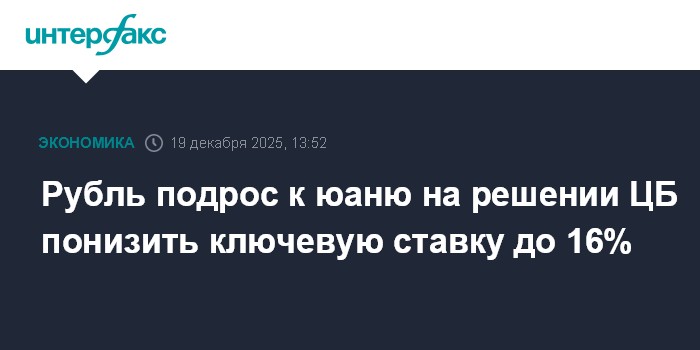 Москва. 19 декабря. INTERFAX.RU - Рубль укрепился к китайскому юаню на Московской бирже в пятницу днем на решении Банка России понизить ключевую ставку на 50 базисных пунктов (б.п.) до 16%.