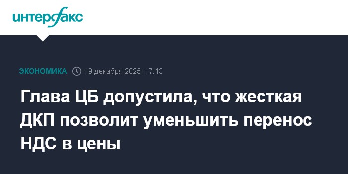 "Мы учли, что повышение НДС может существенно повлиять на цены в ближайшие месяцы. Надо сказать, что оно уже отразилось, на наш взгляд, на инфляционных ожиданиях, но нам еще предстоит оценить, каким будет итоговый эффект. Все это мы будем учитывать, выбирая скорость и траекторию снижения ставки. Мы считаем, что наша жесткая ДКП позволяет уменьшить перенос повышения НДС в цены и позволяет уменьшить вторичные эффекты, все это сдерживает инфляцию", - сказала глава ЦБ.