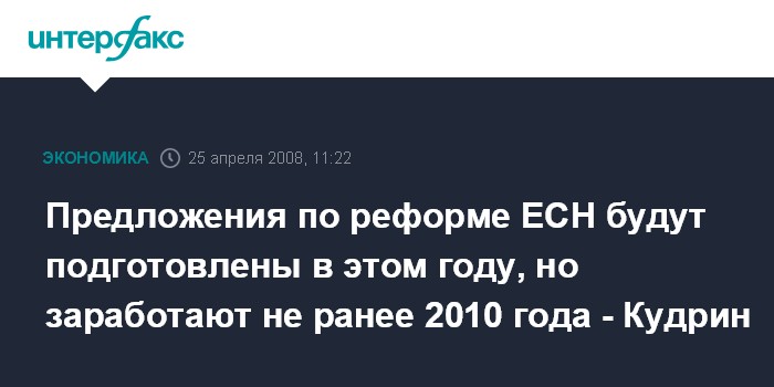 Москва. 25 апреля. ИНТЕРФАКС-АФИ - Предложения по реформе единого социального налога (ЕСН) должны быть подготовлены в этом году, но их не удастся внедрить с 2009 года, заявил вице-премьер - министр финансов РФ Алексей Кудрин.