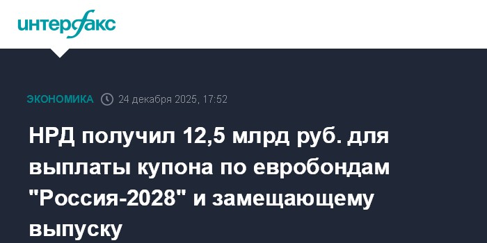 НРД получил 12,5 млрд руб. для выплаты купона по евробондам "Россия-2028" и замещающему выпуску