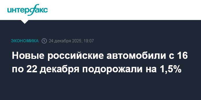 Новые российские автомобили с 16 по 22 декабря подорожали на 1,5%
