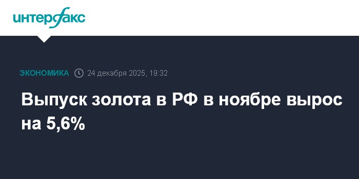 Москва. 24 декабря. INTERFAX.RU - Россия в ноябре увеличила производство золота (необработанного, полуобработанного или в виде порошка) на 5,6% по сравнению с аналогичным месяцем прошлого года, сообщил Росстат в среду.