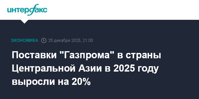 Москва. 25 декабря. INTERFAX.RU - Поставки российского газа потребителям Центральной Азии - Казахстану, Узбекистану, Киргизии - в 2025 году выросли на 20%, сообщил на совещании о предварительных итогах года председатель правления "Газпрома" Алексей Миллер.