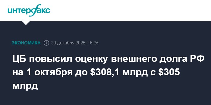 Москва. 30 декабря. INTERFAX.RU - Оценка совокупного внешнего долга РФ по состоянию на 1 октября 2025 года повышена до $308,1 млрд, предварительно он оценивался в $305,0 млрд. Это следует из данных, опубликованных на сайте ЦБ РФ.
