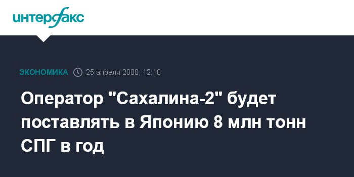 Москва. 25 апреля. INTERFAX.RU - Японские компании будут получать в рамках проекта "Сахалин-2" 8 млн тонн сжиженного природного газа (СПГ) в год, что составляет порядка 83% от всего производства СПГ на Сахалине.