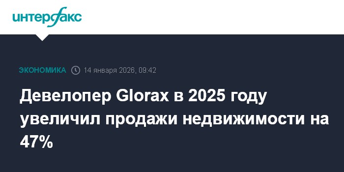 Москва. 14 января. INTERFAX.RU - ПАО "Глоракс" (Glorax) в 2025 году увеличило продажи недвижимости на 47% - до 45,9 млрд рублей, сообщает пресс-служба компании.