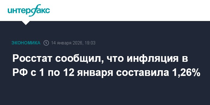 Москва. 14 января. INTERFAX.RU - Инфляция в РФ с 1 по 12 января 2026 года (из-за праздников получился почти в два раза более длинный отрезок времени, чем обычный недельный) составила 1,26%, сообщил в среду Росстат.