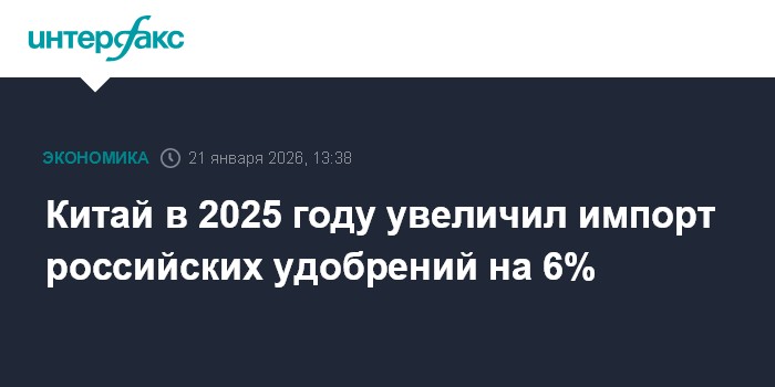 Москва. 21 января. INTERFAX.RU - Поставки российских минеральных удобрений в Китай в 2025 году выросли на 6%, достигнув почти 5 млн тонн, по данным Главного таможенного управления (ГТУ) КНР.