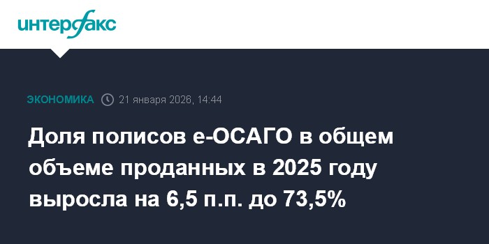 Москва. 21 января. INTERFAX.RU - Доля электронных полисов ОСАГО в общем объеме проданных полисов "автогражданки" за 2025 год увеличилась на 6,5 процентного пункта по сравнению с 2024 годом и составила 73,5%, сообщает Российский союз автостраховщиков (РСА).