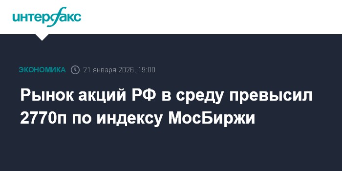 Москва. 21 января. INTERFAX.RU - Российский рынок акций в среду уверенно вырос после заявлений спецпосланника президента США Стива Уиткоффа по теме украинского урегулирования и известий о запланированной встрече с президентом РФ Владимиром Путиным; также поддержку оказала подорожавшая нефть (фьючерс на Brent поднялся к $65 за баррель) и новые рекорды цен на золото (новый пик - $4891 за унцию). Индекс МосБиржи превысил 2770 пунктов и вернулся к уровню конца декабря.