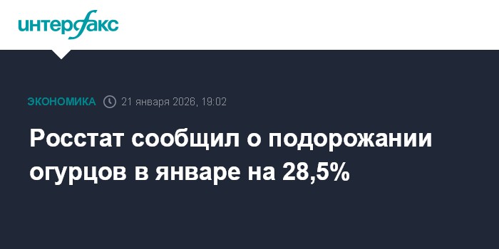 Москва. 21 января. INTERFAX.RU - В России с 1 по 19 января розничные цены на огурцы выросли на 28,5%. За неделю с 13 по 19 января рост составил 6%, сообщил Росстат.