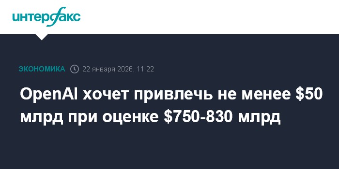 Москва. 22 января. INTERFAX.RU - Американская ИИ-компания OpenAI хочет привлечь не менее $50 млрд в рамках инвестраунда с оценкой $750-830 млрд, сообщает Bloomberg со ссылкой на источники.