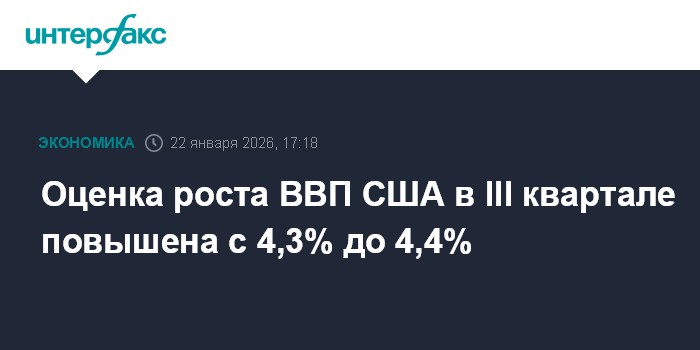Москва. 22 января. INTERFAX.RU - Экономика США в третьем квартале 2025 года увеличилась на 4,4% в пересчете на годовые темпы, согласно окончательным данным министерства торговли страны.