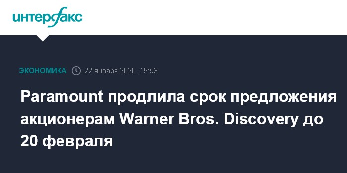 Москва. 22 января. INTERFAX.RU - Paramount Skydance Corp. продлила срок действия недружественного предложения о покупке Warner Bros. Discovery (WBD) примерно на месяц, до 20 февраля, чтобы дать акционерам больше времени на раздумья.