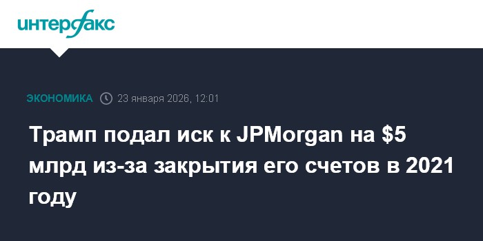 Москва. 23 января. INTERFAX.RU - Президент США Дональд Трамп подал в суд иск к JPMorgan Chase & Co. и его главному исполнительному директору Джейми Даймону, которых он обвиняет в несправедливом закрытии его банковских счетов по политическим причинам. Трамп требует $5 млрд компенсации.