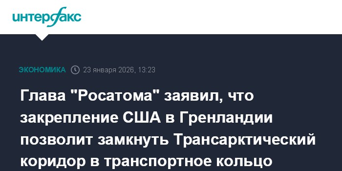 Москва. 23 января. INTERFAX.RU - Трансарктический транспортный коридор в случае закрепления США в Гренландии и сотрудничества с Россией может замкнуться и превратиться в большое транспортное кольцо, считает глава "Росатома" Алексей Лихачев.