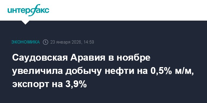 Москва. 23 января. INTERFAX.RU - Добыча нефти в Саудовской Аравии в ноябре увеличилась на 0,5% к октябрю, экспорт - на 3,9%, сообщает сайт Joint Organization Data Initiative (JODI).