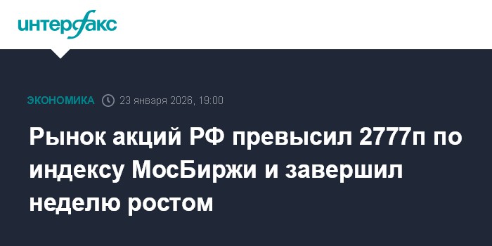Москва. 23 января. INTERFAX.RU - Рынок акций РФ в пятницу подрос по индексам в ожидании первого раунда трехсторонних переговоров США-РФ-Украина по украинскому урегулированию; факторами поддержки также выступили дорожающие металлы и нефть (фьючерс на Brent превысил $65,6 за баррель). Индекс МосБиржи превысил 2777 пунктов, обновив на закрытие торгов максимум с 18 сентября 2025 года.