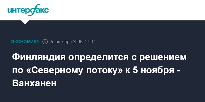 Санкт-Петербург. 25 октября. INTERFAX.RU - Решение правительства Финляндии о прокладке газопровода "Северный поток" через экономическую зону страны на Балтике будет, как ожидается, принято 5 ноября, сообщил премьер Финляндии Матти Ванханен. "Ситуация выглядит таким образом, что к 5 ноября правительством будут подготовлены предложения по принятию положительного решения относительно "Северного потока", дальше дело за экологической экспертизой", - сказал финский премьер на пресс-конференции после переговоров в Петербурге с российским коллегой Владимиром Путиным.