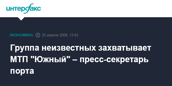 Одесса. 25 апреля. INTERFAX.RU - Большая группа неизвестных в настоящее время захватывает морской торговый порт "Южный" (Одесская область). Как сообщила агентству "Интерфакс" пресс-секретарь порта Ирина Чибирова, группа людей в количестве около 1 тыс. человек прошла на территорию порта и в настоящее время окружила портоуправление.
