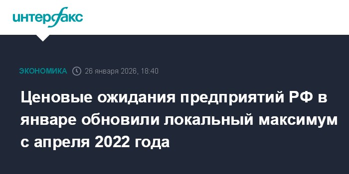 Москва. 26 января. INTERFAX.RU - Ценовые ожидания предприятий в январе увеличивались четвертый месяц подряд, превысив отметки конца 2024 года и обновив локальный максимум с апреля 2022 года, говорится в комментарии ЦБ РФ по итогам опроса компаний.