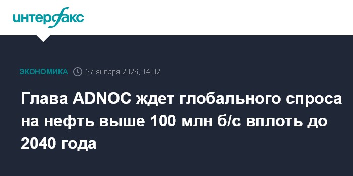 Москва. 27 января. INTERFAX.RU - Глобальный спрос на нефть будет превышать 100 млн баррелей в сутки вплоть до 2040 года, при этом спрос на СПГ и электроэнергию вырастет на 50% или более, прогнозирует глава Abu Dhabi National Oil Company (ADNOC) Султан Ахмед Аль-Джабер. Как передает Reuters, он заявил об этом на мероприятии India Energy Week.
