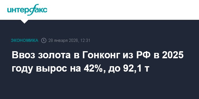 Москва. 28 января. INTERFAX.RU - Ввоз золота в Гонконг из России в 2025 году составил 92,1 тонны на 82 млрд гонконгских долларов ($10,5 млрд), говорится в материалах статистического департамента правительства Гонконга, специального административного района КНР.
