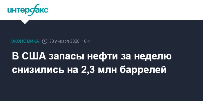 Москва. 28 января. INTERFAX.RU - Коммерческие запасы нефти в США на прошлой неделе сократились на 2,3 млн баррелей - до 423,8 млн баррелей, сообщило Министерство энергетики страны.