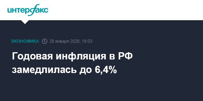 Москва. 28 января. INTERFAX.RU - Инфляция в РФ с 20 по 26 января 2026 года составила 0,19% после 0,45% с 13 по 19 января и 1,26% с 1 по 12 января (из-за праздников получился почти в два раза более длинный отрезок времени, чем обычный недельный), сообщил в среду Росстат.