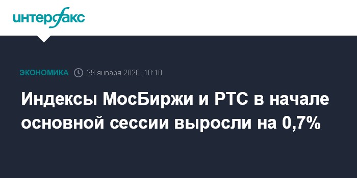 Москва. 29 января. INTERFAX.RU - Российский рынок акций на старте торгов основной сессии на "Мосбирже" в четверг продолжил рост после выхода данных Росстата о замедлении недельной инфляции, а также на фоне продолжающегося ралли сырьевых рынков (драгметаллы обновляют максимумы, фьючерс на Brent превысил $69 за баррель) в условиях сохраняющейся геополитической напряженности.