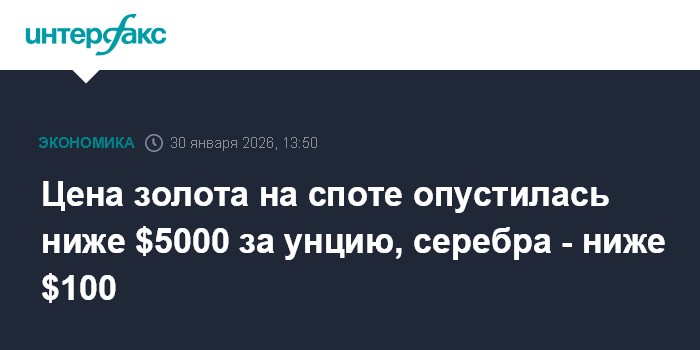 Москва. 30 января. INTERFAX.RU - Цена золота в пятницу опустилась ниже отметки в $5000 за унцию, серебра - ниже $100 за унцию на фоне укрепления доллара США.