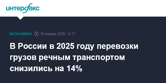 Москва. 30 января. INTERFAX.RU - В России в 2025 году перевозки грузов речным транспортом сократились на 14% по сравнению с 2024 годом, сообщил глава Минтранса Андрей Никитин на круглом столе "Перспективы развития речных грузовых перевозок во взаимодействии с железнодорожными и автомобильными перевозками".