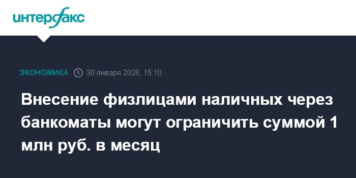 Москва. 30 января. INTERFAX.RU - Минфин предлагает обязать банки отказывать физлицам во внесении наличных на счет (вклад) через банкоматы или другие технические устройства на сумму, превышающую 1 млн руб. в месяц. Инициатива подготовлена в соответствии с планом мероприятий по "обелению" отдельных секторов экономики, одобренного правительством РФ.