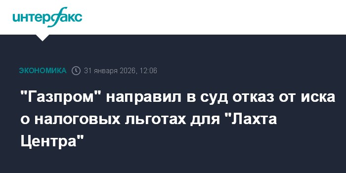 Москва. 31 января. INTERFAX.RU - "Газпром" направил в суд заявление об отказе от иска о налоговых льготах для "Лахта Центра".