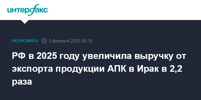 РФ в 2025 году увеличила выручку от экспорта продукции АПК в Ирак в 2,2 раза