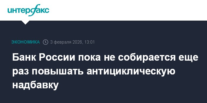 Москва. 3 февраля. INTERFAX.RU - Банк России пока не планирует дальше повышать антициклическую надбавку, заявил на пресс-конференции заместитель директора департамента финансовой стабильности Банка России Евгений Румянцев.