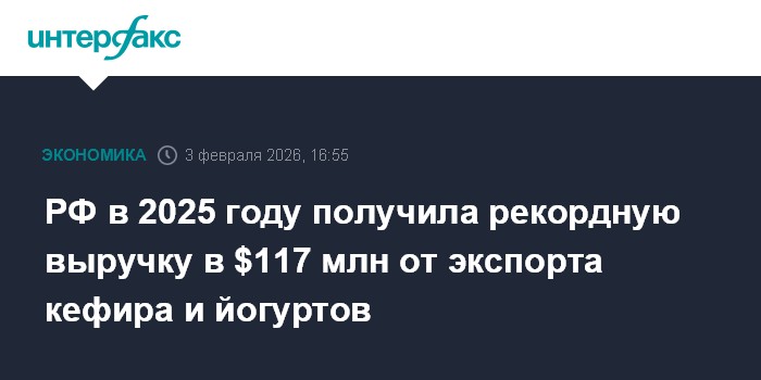 Москва. 3 февраля. INTERFAX.RU - Выручка РФ от экспорта в 2025 году кефира, йогурта, а также пахты превысила $117 млн, что стало рекордным показателем. В натуральном выражении было отгружено 74 тыс. тонн этой продукции, сообщает федеральный центр "Агроэкспорт" со ссылкой на экспертов.