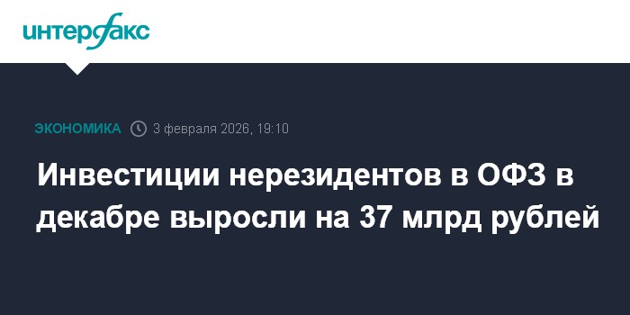 Москва. 3 февраля. INTERFAX.RU - Объем инвестиций нерезидентов в ОФЗ в декабре 2025 года увеличился на 37 млрд рублей, или на 3,8%, до 1,0 трлн рублей, сообщается на сайте ЦБ РФ.