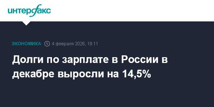 Москва. 4 февраля. INTERFAX.RU - Просроченная задолженность по заработной плате в России на конец декабря 2025 года составила 2 млрд 27,2 млн рублей и по сравнению с ноябрем повысилась на 256,8 млн рублей, или на 14,5%, сообщил в среду Росстат.
