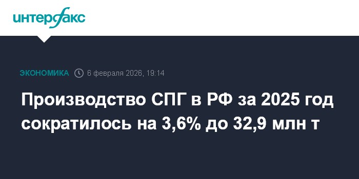 Производство СПГ в РФ за 2025 год сократилось на 3,6% до 32,9 млн т