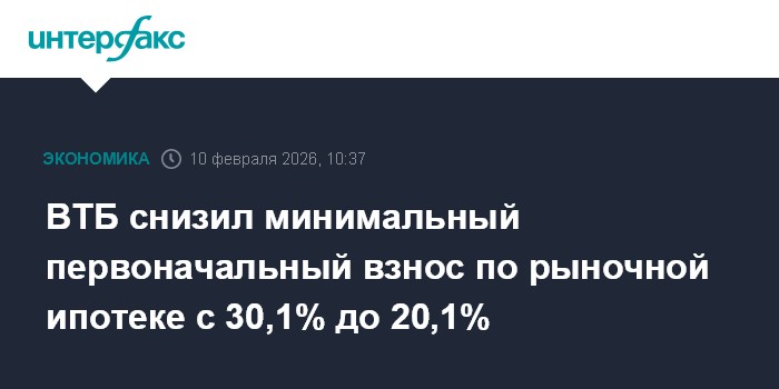 Москва. 10 февраля. INTERFAX.RU - ВТБ с 10 февраля снизил минимальный первоначальный взнос по рыночной ипотеке для заемщиков с подтвержденным доходом с 30,1% до 20,1%, сообщает пресс-служба банка.