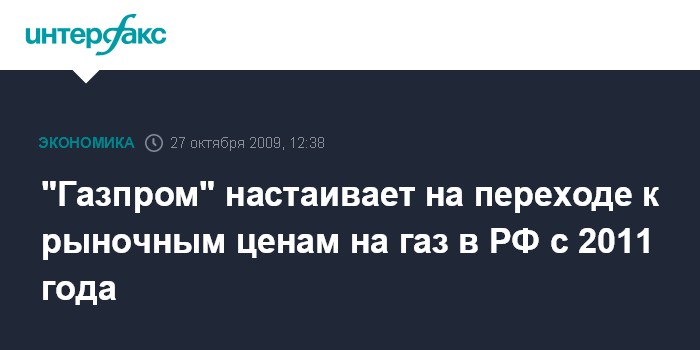 Москва. 27 октября. INTERFAX.RU - Совет директоров "Газпрома" на заседании во вторник рассмотрел вопрос о политике цен на газ и нефтепродукты российским потребителям в условиях кризиса. Как сообщила пресс-служба "Газпрома", "правлению поручено продолжить работу с федеральными органами государственной власти по переходу к рыночным принципам ценообразования на газ, поставляемый на внутренний рынок, с 2011 года", - говорится в пресс-релизе.