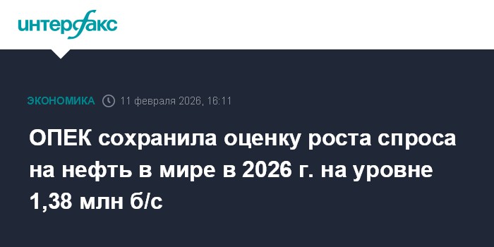 Москва. 11 февраля. INTERFAX.RU - Мировой спрос на нефть в 2026 году вырастет на 1,38 млн б/с и достигнет 106,52 млн б/с, говорится в ежемесячном отчете ОПЕК.