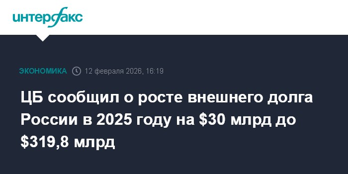 ЦБ сообщил о росте внешнего долга России в 2025 году на $30 млрд до $319,8 млрд